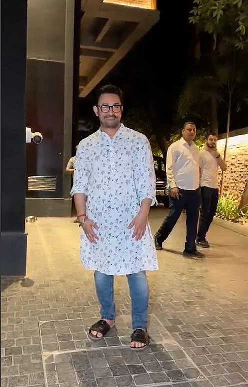 The Andaz Apna Apna actor looked classic in a white kurta, which he paired with blue denim.