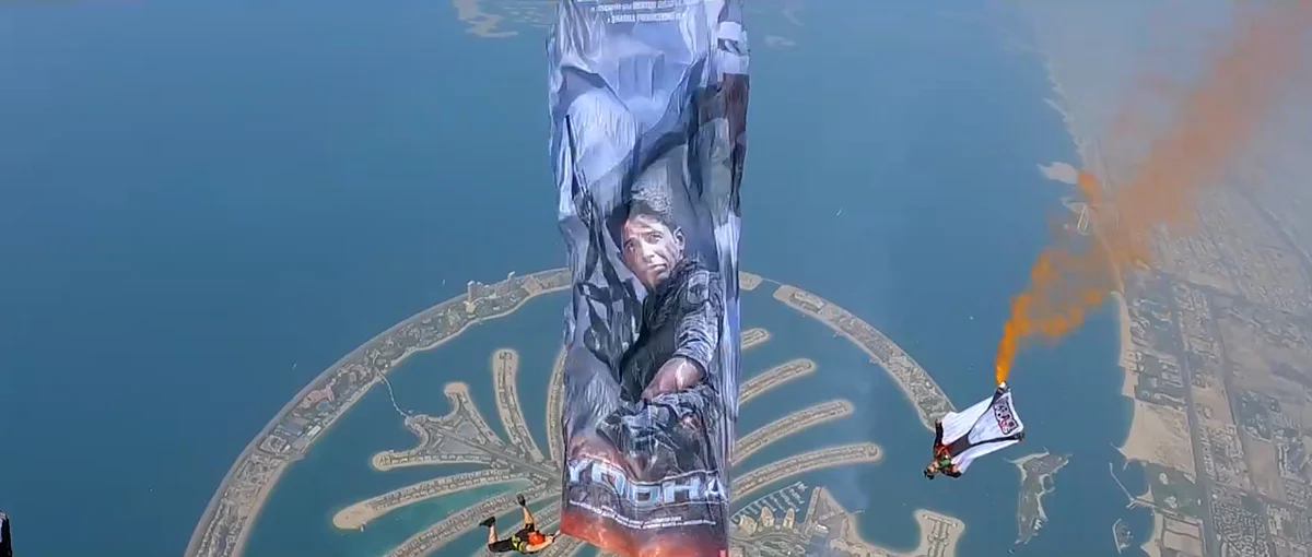 The video begins with spectacular shots of Dubai's skyline and its famous landmarks before the words: 'A grand reveal that defies gravity,' comes on screen. Then the crew members of Skydive Dubai can be seen boarding an aircraft before they unleash the poster mid-air over the Palm Jumeirah. Then, the words come on screen which says: "First ever Hindi film poster launch at 13,000 ft."