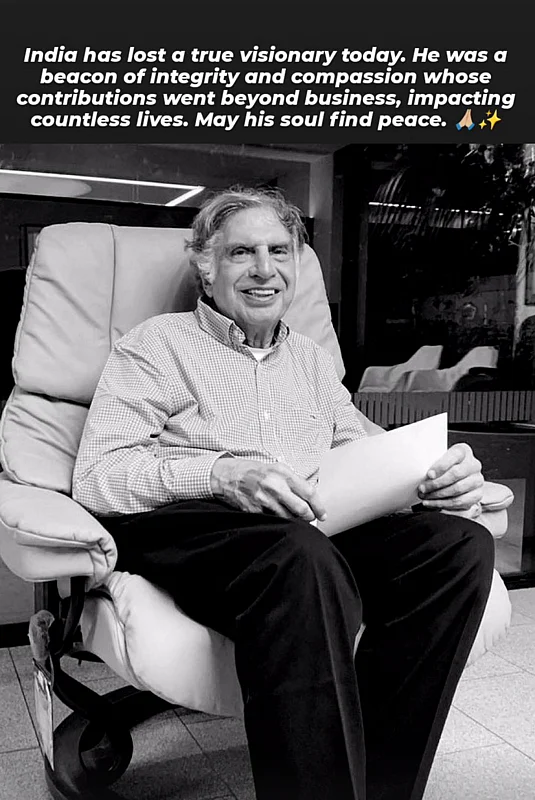 Anushka Sharma shared on her Instagram story, "Deeply saddened by the news of Shri Ratan Tataji. He upheld the values of integrity, grace and dignity through everything he did and was truly an icon and Taj of India. RIP sir, you have touched so many lives."