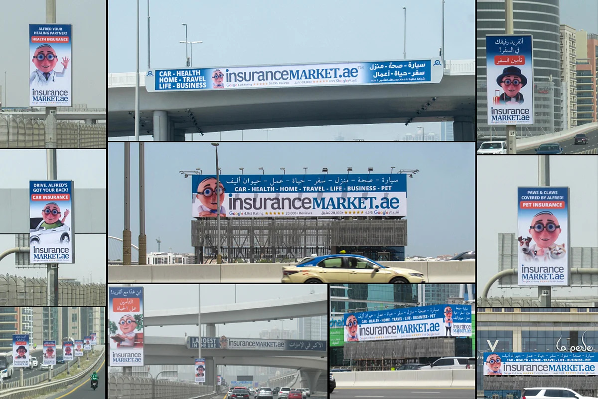 Alfred now proudly graces over 97 lampposts, commands attention from 11 prime billboards, shines from unipoles, and dazzles onlookers from two commanding megacoms across the city. His ubiquity isn't just a testament to a well-executed marketing strategy; it's a reflection of the city's trust in the brand he represents. With every appearance, Alfred reminds Dubai's residents of the unparalleled services and reliable insurance solutions offered by InsuranceMarket.ae if they are looking for anything in insurance.