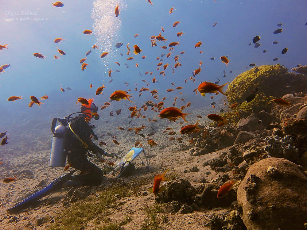 With an oxygen tank and painting supplies, artist Olga Belka sets up for a day's work in her studio - underwater, surrounded by colourful fish and sea turtles.