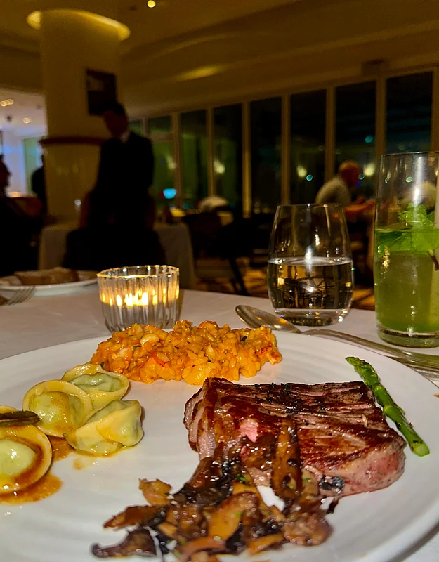 For a truly memorable main course, don't miss the Tagliata di Wagyu, a grilled Australian Wagyu beef NY strip seasoned with black lava salt and served with asparagus and forest mushrooms. The Wagyu's rich, buttery texture is complemented by the simplicity of the seasoning and the freshness of the vegetables, making this dish a true highlight of the menu.
