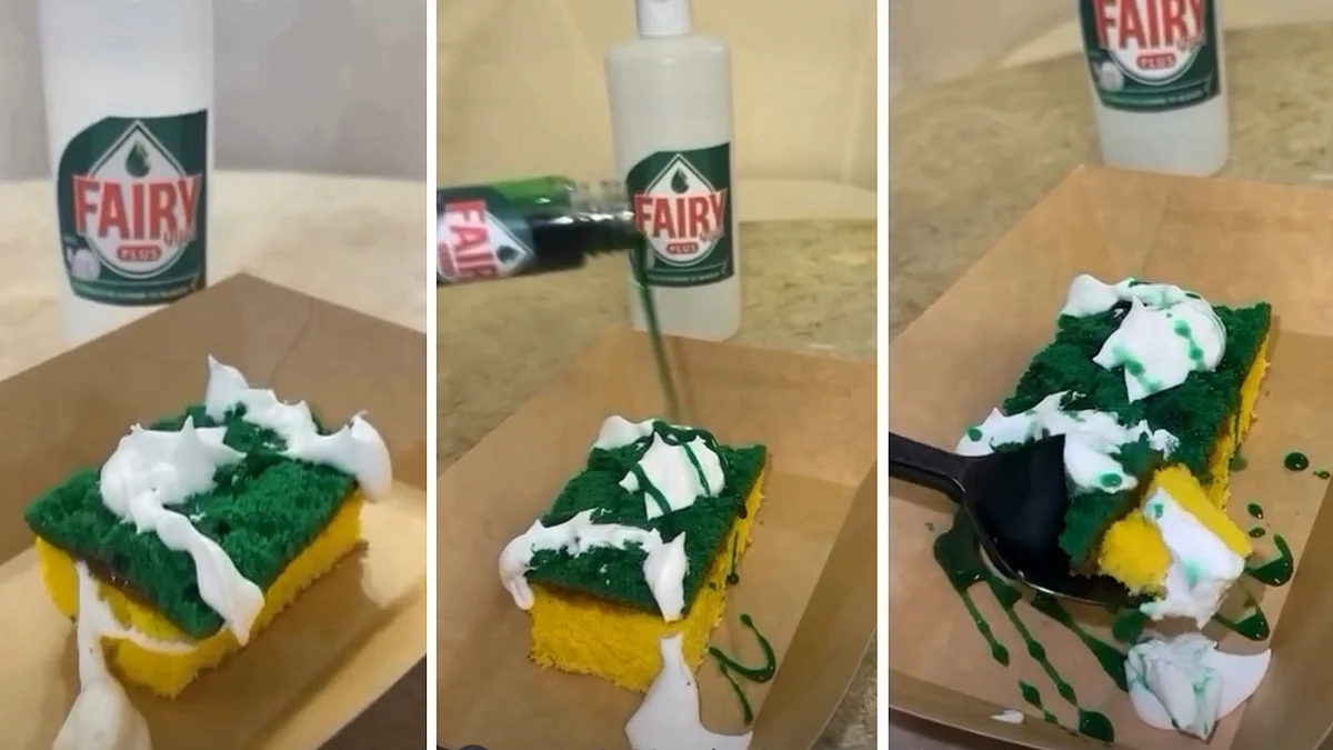 The cake that quite literally resembles a dishwashing sponge with Fairy washing liquid on it is a clever and playful example of the realistic cake trend. This type of cake is designed to resemble a common kitchen sponge, complete with the yellow porous texture and green scrubbing pad on top.