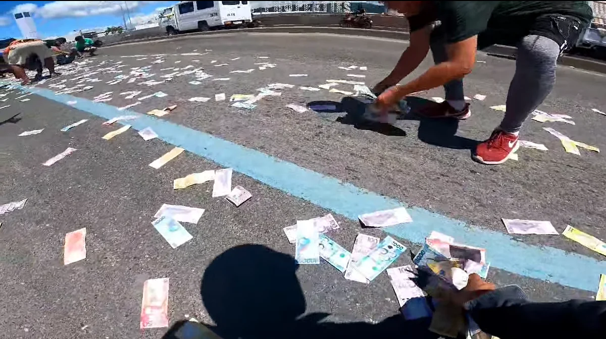 In this video, people are seen scooping up bank notes in different denominations, from 20 to 1,000-peso bills: