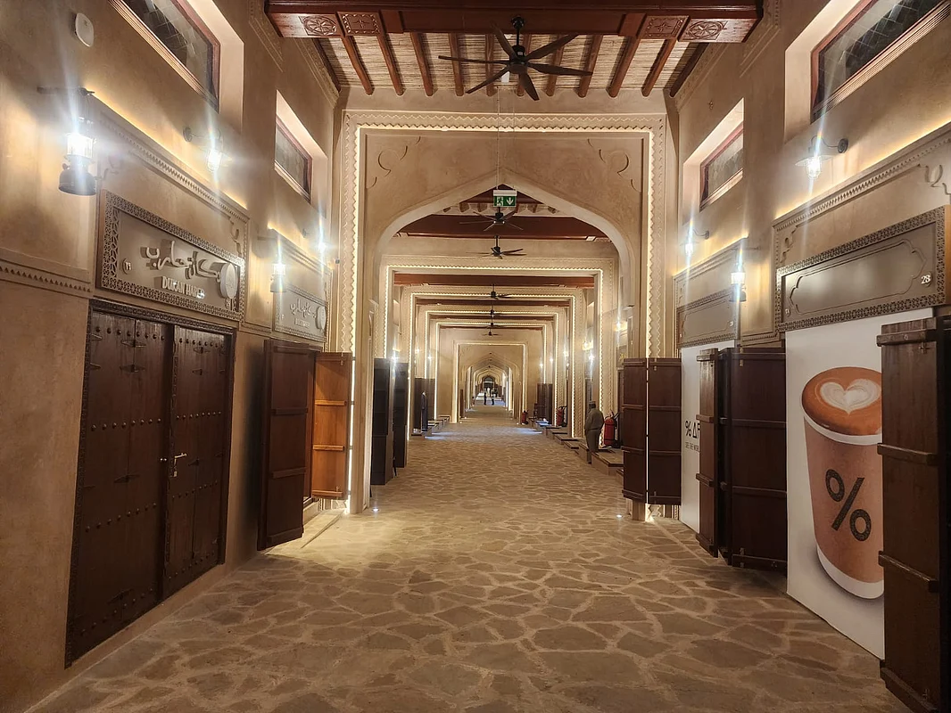 The market houses around 34 shops. Visitors can browse jalabiya and abaya stores, oud and bakhoor outlets, coffee houses and grocery-style shops that resemble old neighbourhood baqalas.