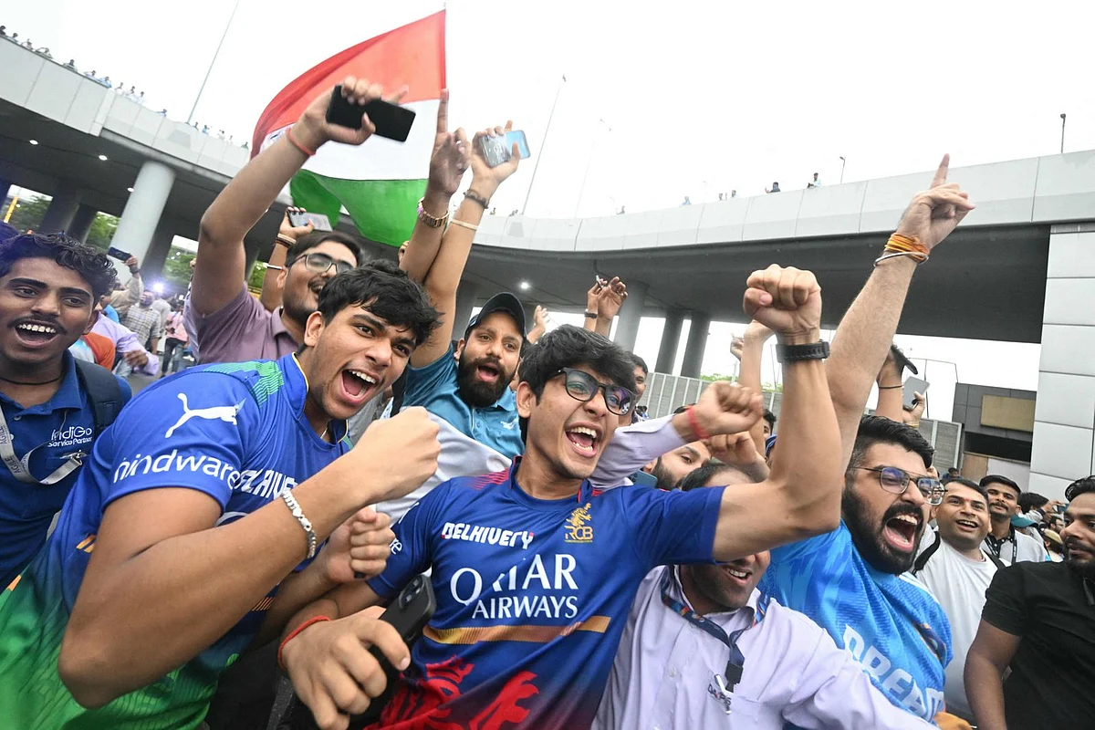 Despite monsoon rain, crowds gathered outside New Delhi's airport long before dawn, waiting for a glimpse of their idols, who had beaten South Africa on Saturday in a thrilling final in Barbados.