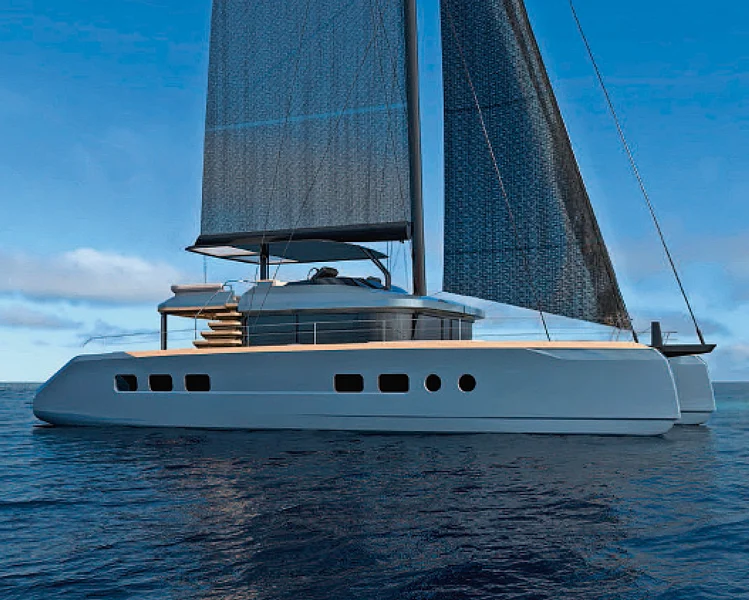 It is a 47-foot (about 15 meters) catamaran in latest generation 5083 aluminium. An integrated system of automotive-derived lithium batteries, solar panels and a super-innovative storage system guarantees extended autonomy: what today's boats do by keeping the diesel generators running 24 hours a day, here is possible with 4/5 hours of ignition. In short, you can sleep with the air conditioning on all night without using the generator. Another distinctive feature, as well as an unprecedented design formula, is the engine positioned at the center of the catamaran instead of the stern: in addition to providing better weight distribution, it allows direct access to the sea from the aft, or main, cabins. You can wakes up in the morning and dive straight into the sea.