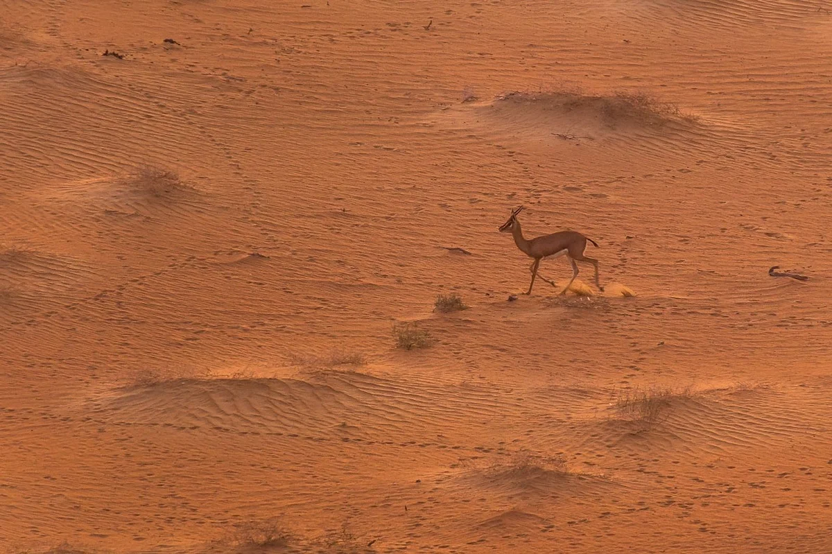 Gazelles, Arabian oryx, and camels are spotted wandering through the vast desert in the peaceful quiet.