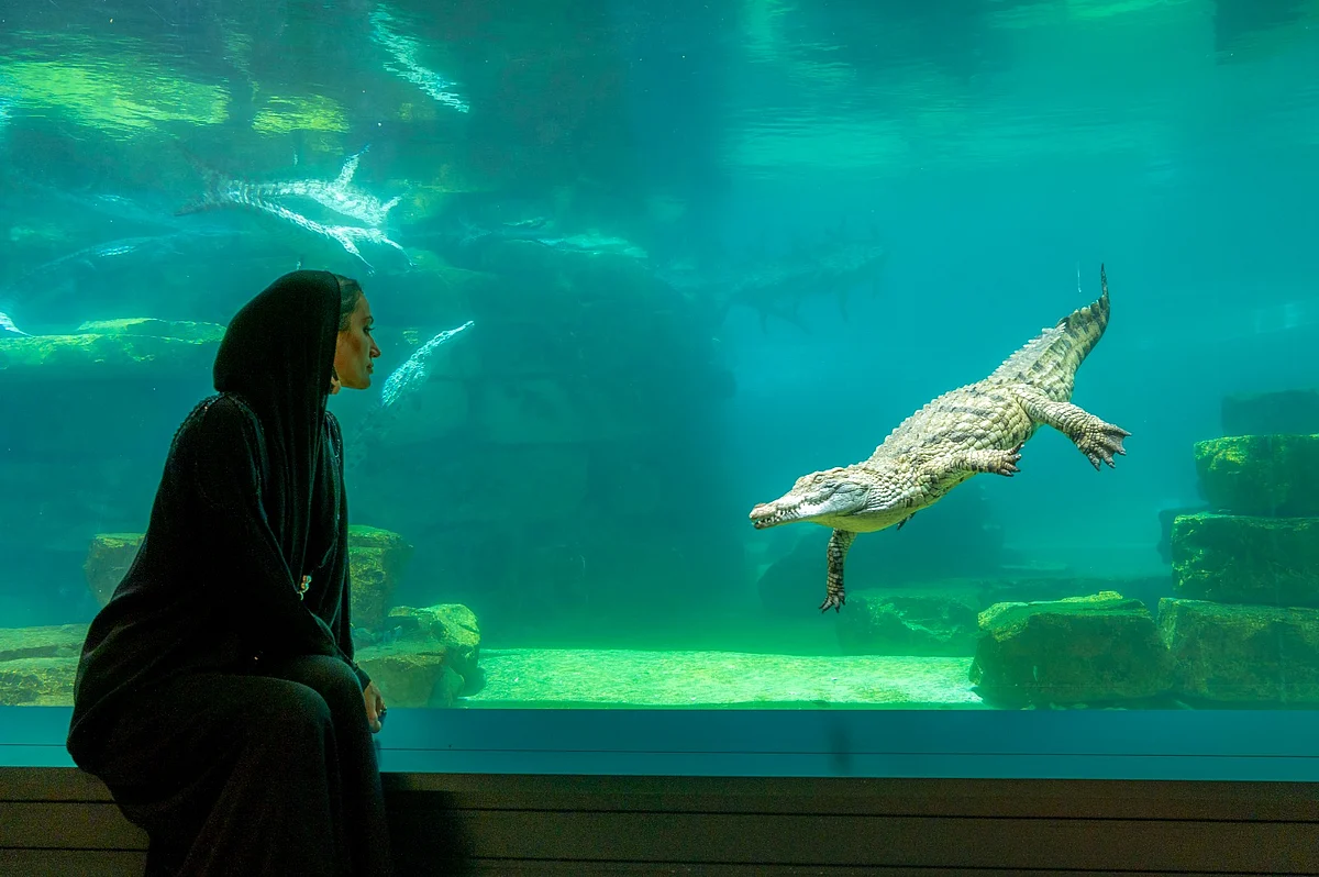 All the big ones are male crocodiles that usually reach 4.5m in length but it's explained it's not a question of size alone that acts as a differentiator. The shape of snot is different as well. The male is equipped to fight during the mating season, so it has a stronger and larger snot. All the crocodiles in the park are the same age. The male are 25 years old, and the female crocodiles are around 20 years old. The female cros have arrived in Dubai from South Africa and the male crocs have come from a park in Tunisia. They live up to an average age of 70-80 years just like humans. They can also reach up to 100 years.