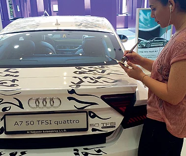 “It's Arabic letters in freestyle of calligraphy. I'm trying to emphasise the speed of the car so if you look from the front, it has the effect that if the car goes at a fast speed, the letters scatter on the sides. So I'm giving it motion, and the form and shape of the car also helps.” It's a brand new car - a 2015 model - and Al Rawi is not sure whether it is to be auctioned after she lays the finishing strokes. “It might be on display at their showroom”. She laughs when asked, is your back hurting? “No, no. It's a lot of fun. You feel the pain at night, but it's just ... it's not labour, it's a social event.”