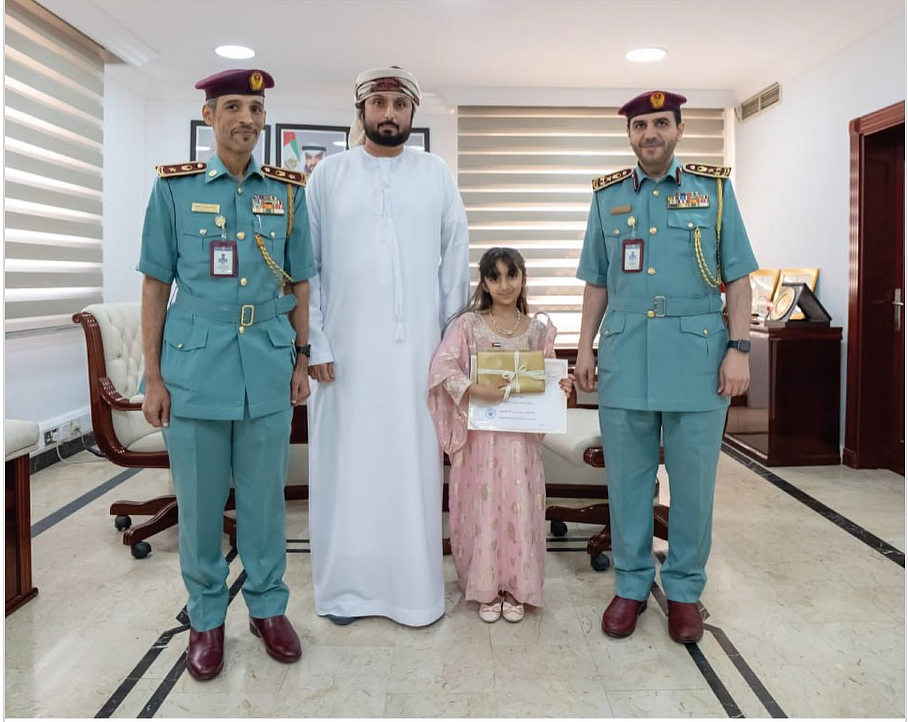 Authorities at Musherif Police Station presented the girl, named Shaima Ali, and officers posed with her holding the special reognition beside her father at the station, commending her positive attitude.