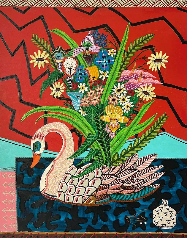 Just near the entrance, a painting caught my eye: a swan, regal and calm, with a wild bouquet of flowers blooming from its back. I laughed. Actually laughed. It disarmed me completely — I smiled like the Cheshire Cat, caught off guard by its strange familiarity. The piece — by Jordy Kerwick — was surreal, mythic, and quietly magnetic. I live in Bali, where people are friendly, so I asked the man nearby, “What is this?”