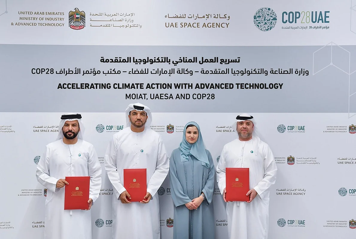 According to the agreement inked at the Abu Dhabi Energy Centre, the Ministry of Industry and Advanced Technology (MoIAT), UAE Space Agency (UAESA), and COP28, through the Office of the UAE Special Envoy for Climate Change, will partner to engage support of local and global technology and space sectors for COP28. They will work together to encourage organisations in these sectors to share their contributions towards climate efforts at COP28's Technology and Innovation Hub. The collaboration aims to harness emerging technological innovations and developments to tackle global climate change.