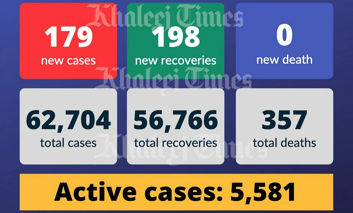 The UAE Ministry of Health and Prevention on Monday reported 179 new cases of the Covid-19 coronavirus, along with 198 recoveries. No deaths were reported.
