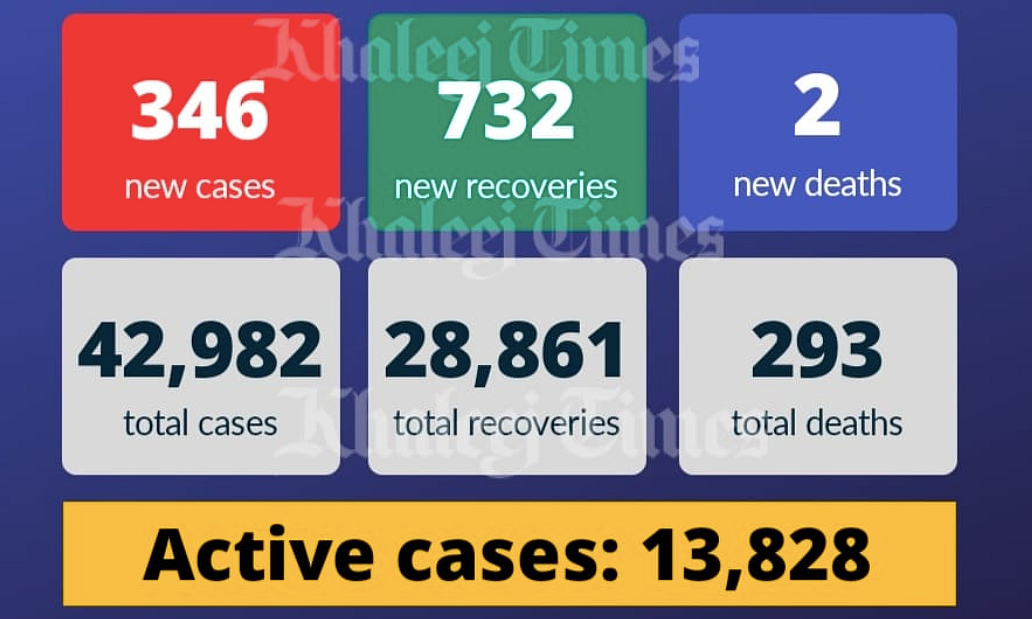 The UAE Ministry of Health and Prevention on Tuesday reported 346 new cases of the Covid-19 coronavirus, along with 732 cases of recovery.