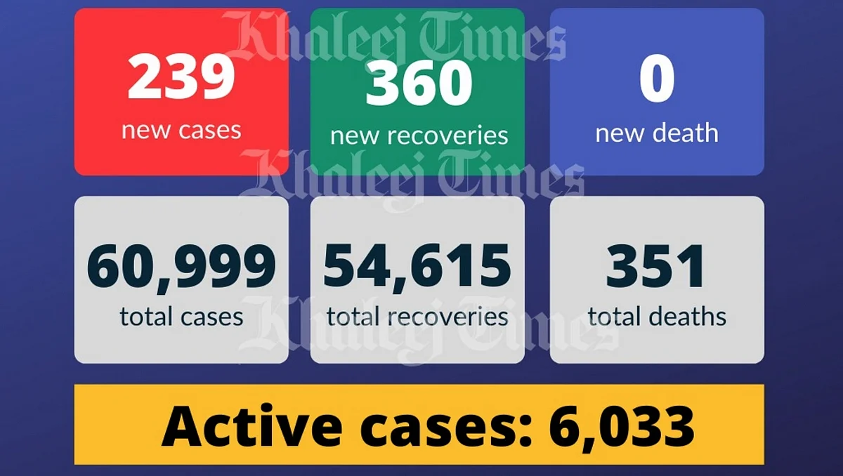 The UAE Ministry of Health and Prevention on Sunday reported 239 cases of the Covid-19 coronavirus, along with 360 recoveries. No new deaths were reported.