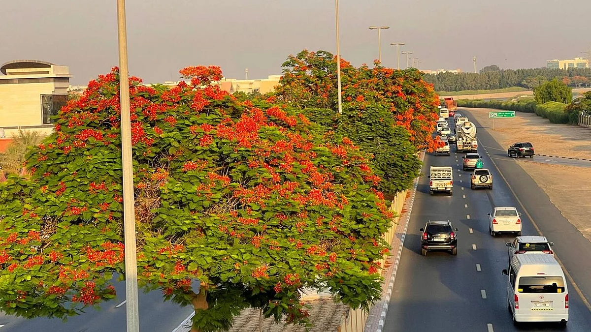 What sets the royal poinciana apart is its unique characteristic of blooming in the autumn and throughout the scorching summer months. With the ability to withstand the salty water and extreme heat of Dubai's summers, these resilient trees have become an integral part of the city's streetscape.