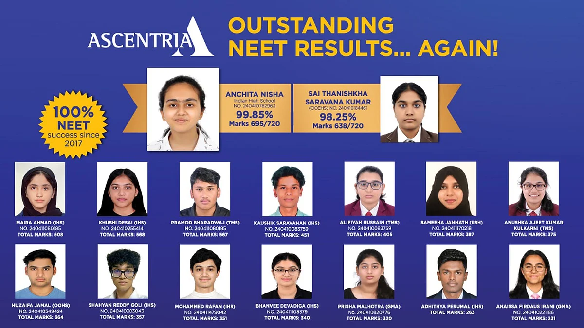 These success stories are emblematic of a broader trend of excellence achieved by students preparing for NEET and other entrance exams under the guidance of institutes like Ascentria, even outside the borders of India. With a remarkable 100 per cent success rate in NEET since 2017, Ascentria has consistently proven its ability to prepare students for the rigours of such examinations, facilitating placements in prestigious government and private colleges, including renowned institutions like IITs, NITs, AIIMS and Manipal.