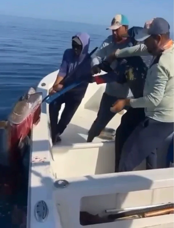 In the clip, the massive fish can be seen fiercely thrashing in the water as it tries to break free, while four men struggle to lift it onto the boat — a task that took tremendous effort. Even after being brought aboard, the fish continued to flop violently, still reacting to being out of its natural habitat.