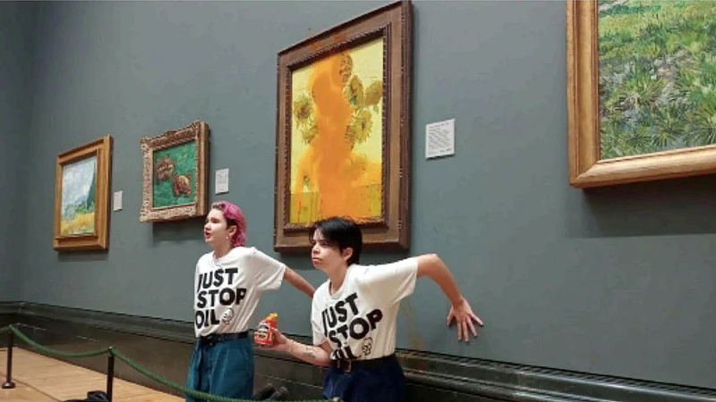 Two Just Stop Oil activists hurled tomato soup over one of Vincent van Gogh's "Sunflowers" paintings at London's National Gallery. Another spray-painting protest by the same group y targeted the headquarters of London's Metropolitan Police, who arrested 28 demonstrators.