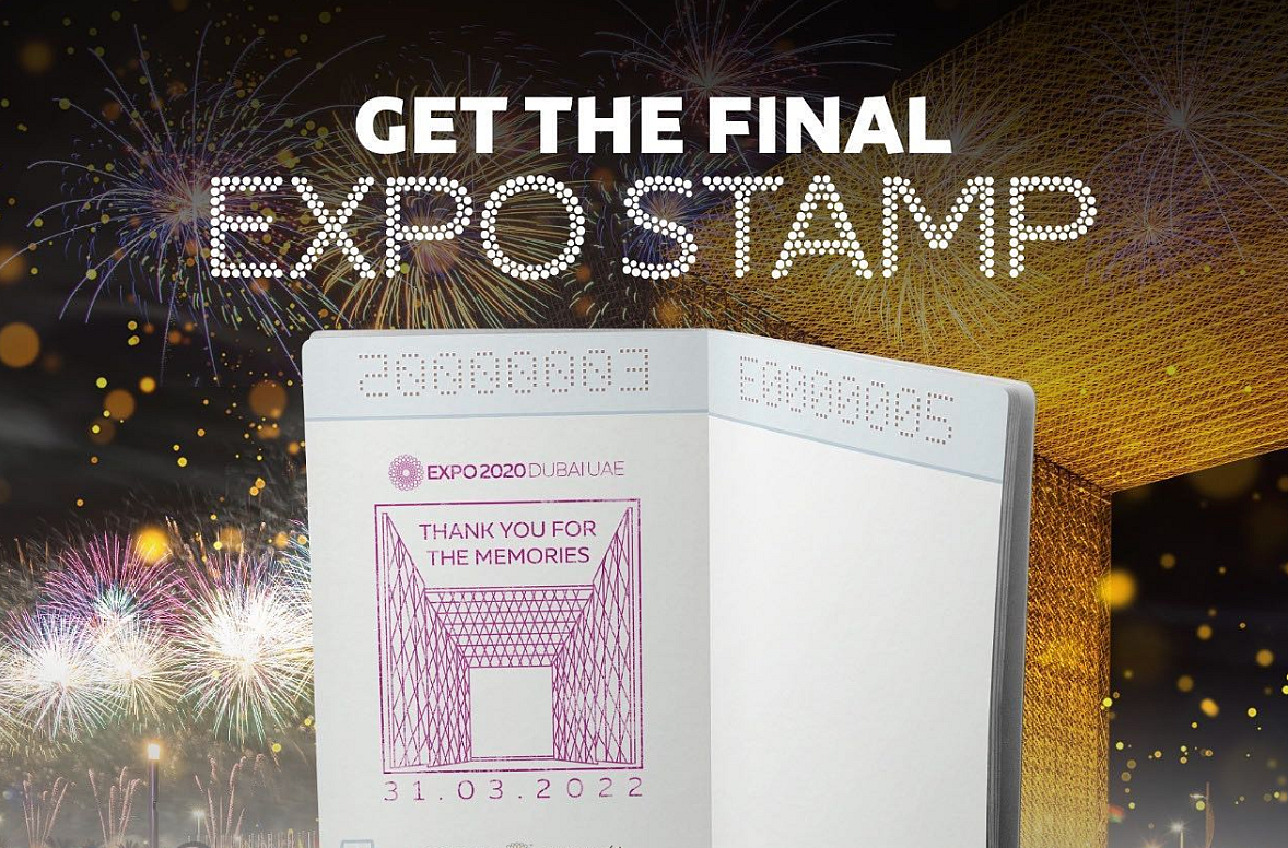 The special closing stamp can be collected at Thematic Pavilions and the Family, Visitor Centres, Concourses – Majlis, Expo explorer stations.
