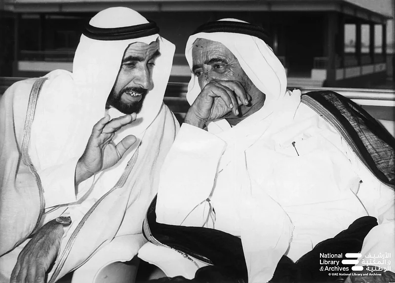 The National Archive also preserves moments of camaraderie among the leadership, with a photograph showing Sheikh Rashid bin Saeed Al Maktoum, Sheikh Rashid bin Ahmed Al Mualla, and Khalaf bin Ahmed Al Otaiba in a friendly conversation at the Guest Palace in Jumeirah during the period of July 10-18, 1971.