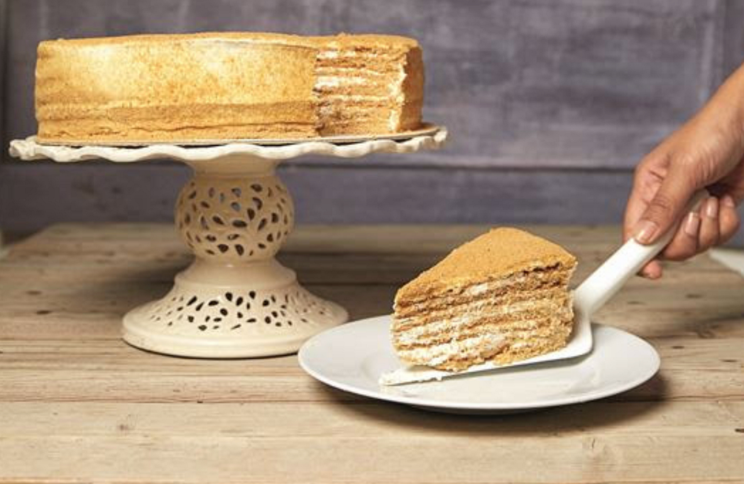 The Honey Cake is made from seven thin rounds of cake, layered with fresh cream then sprinkled all over with crumbs of the honey cake mix which is made of all natural ingredients.
