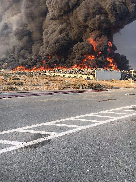 A massive fire broke out in a tyre dumping area in Al Hamriya area No. 2 in Sharjah.