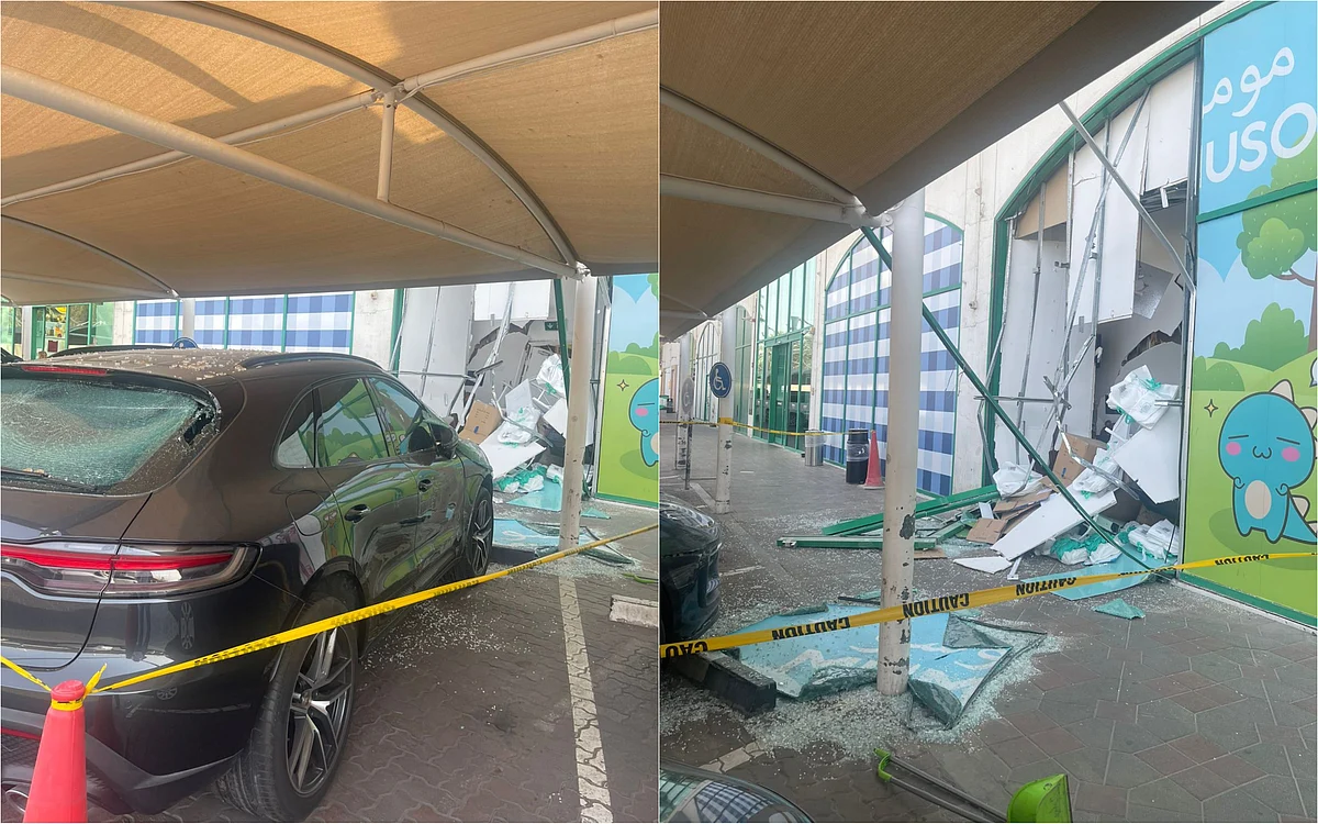 The incident occurred when an SUV drove into the Mumuso store at the Spinneys building in Jumeirah. Shattered glass and broken window panes remained scattered around the site for several hours after the crash.