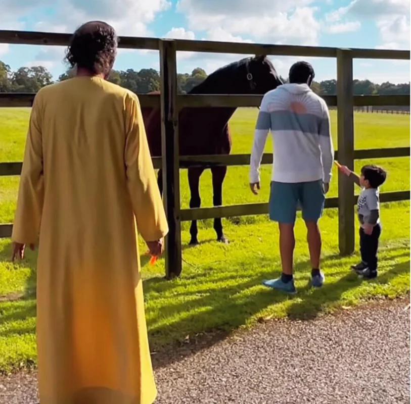 Dubai Crown Prince Sheikh Hamdan bin Mohammed bin Rashid Al Maktoum has posted an adorable video of his son Rashid meeting the racehorse Dubawi as his father His Highness Sheikh Mohammed bin Rashid Al Maktoum, Vice-President and Prime Minister of the UAE and Ruler of Dubai, looks on.