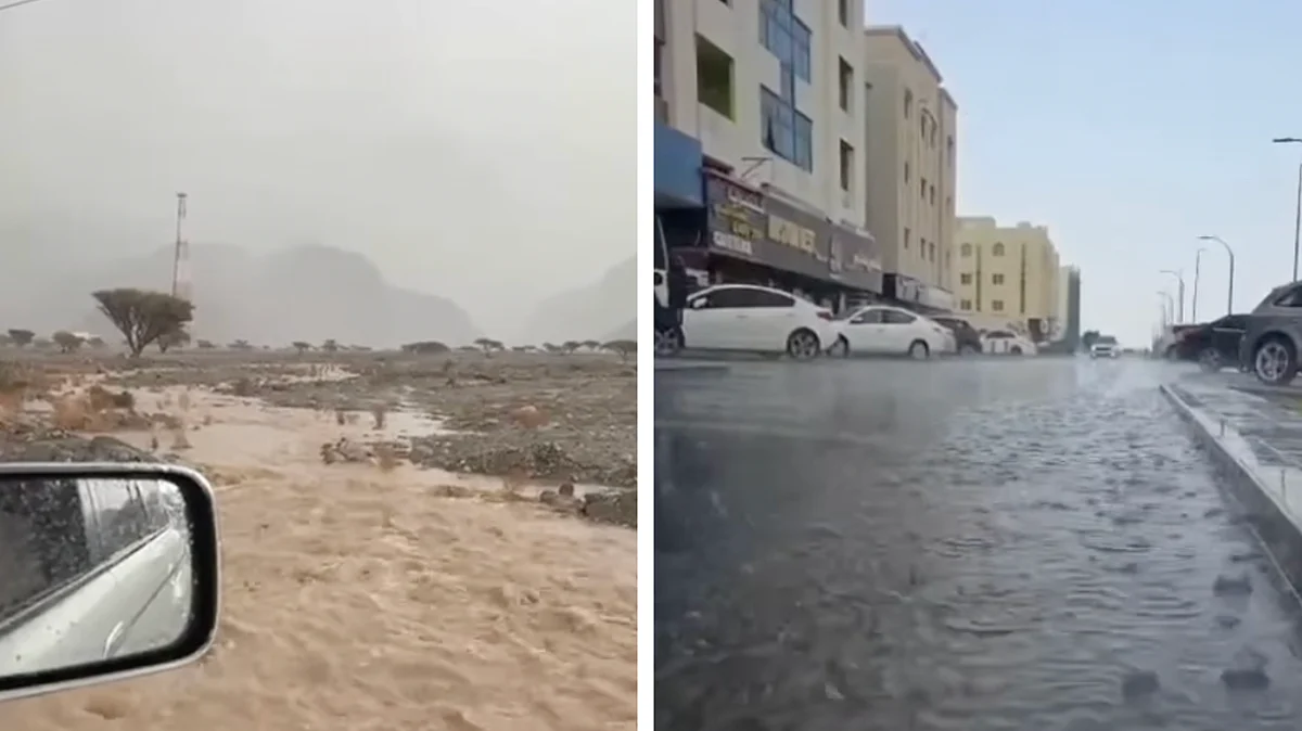 Videos circulating online showed cars navigating through flooded roads, with wheels splashing through brown waters. Desert paths turned into rivers as the rains continued through the afternoon in Ras Al Khaimah.