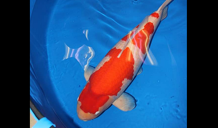 Koi Carp, which originated in Japan, come in more than a dozen varieties and are distinguished by their colouring, patterning, and scalation. The Kohaku variety is a white-skinned koi, with large red markings on the top. The perfect Kohaku will have pristine white without any discolouration of yellowing.