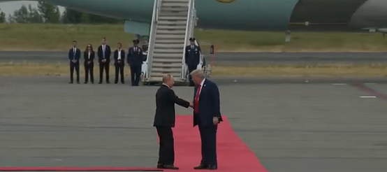 Trump disembarked his plane, Air Force One, and awaited Putin on the tarmac. The two exchanged greetings while smiling. US F-22 aircraft were placed on either side of the red carpet.
