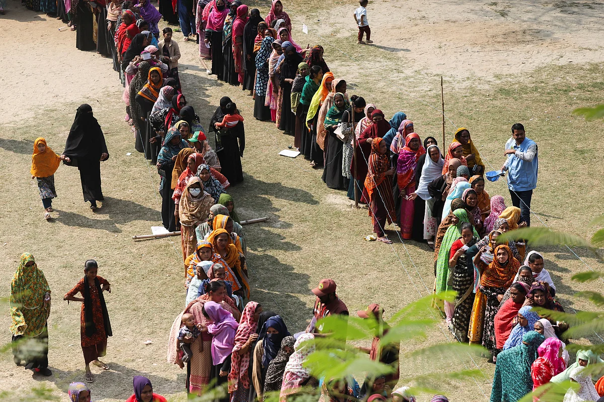 On Thursday morning, on the fringes of Dhaka city, outside a primary school converted into a temporary voting booth, a long line of burqa-clad women waited to vote.