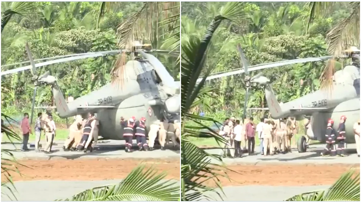 #WATCH | Kerala: A portion of the helipad tarmac sank in after a chopper carrying President Droupdi Murmu landed at Pramadam Stadium. Police and fire department personnel deployed at the spot physically pushed the helicopter out of the sunken spot. pic.twitter.com/QDmf28PqIb