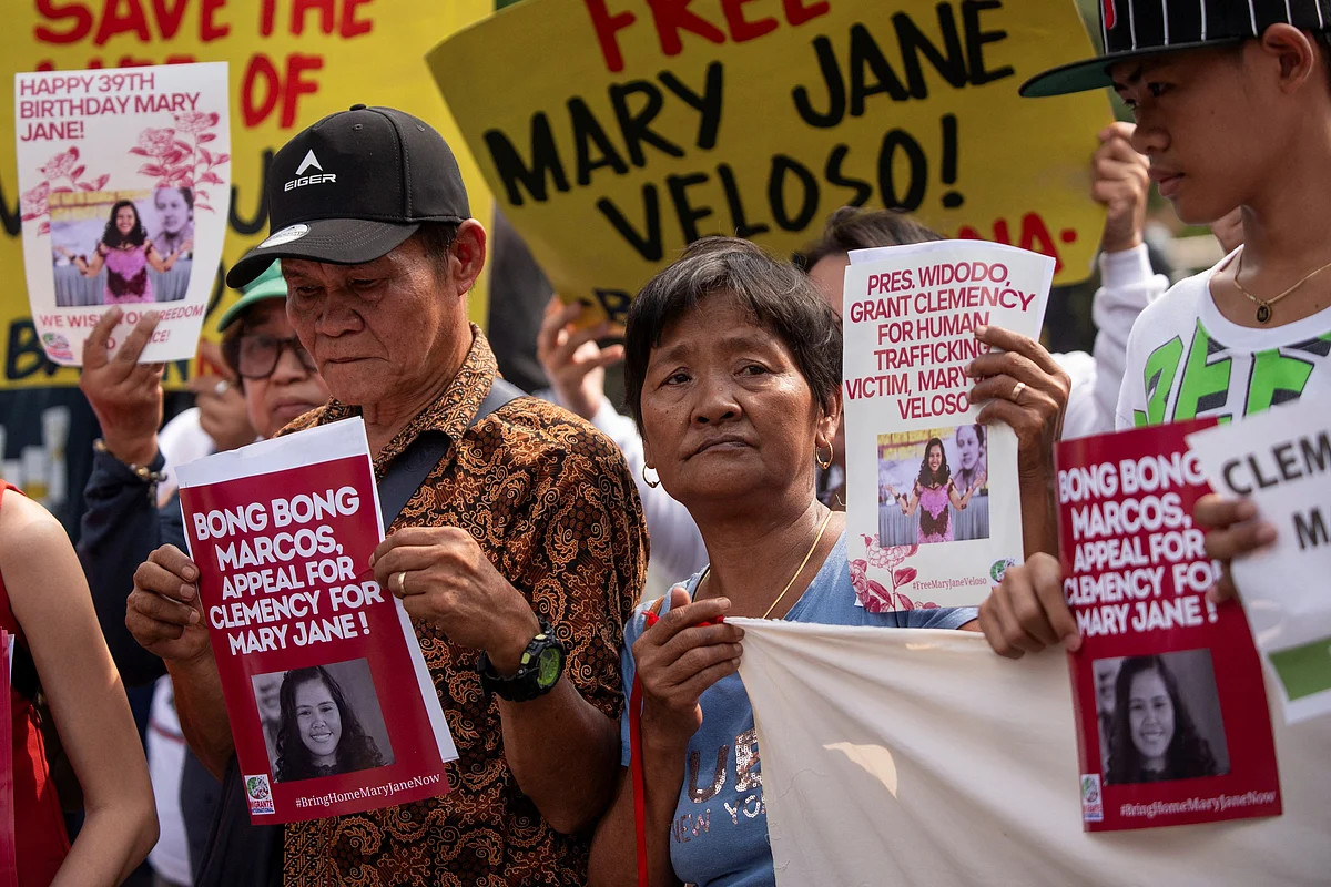 Family and supporters of Veloso held a small protest near the presidential palace in Manila on Wednesday as Philippine President Ferdinand Marcos met with his Indonesian counterpart Joko Widodo.