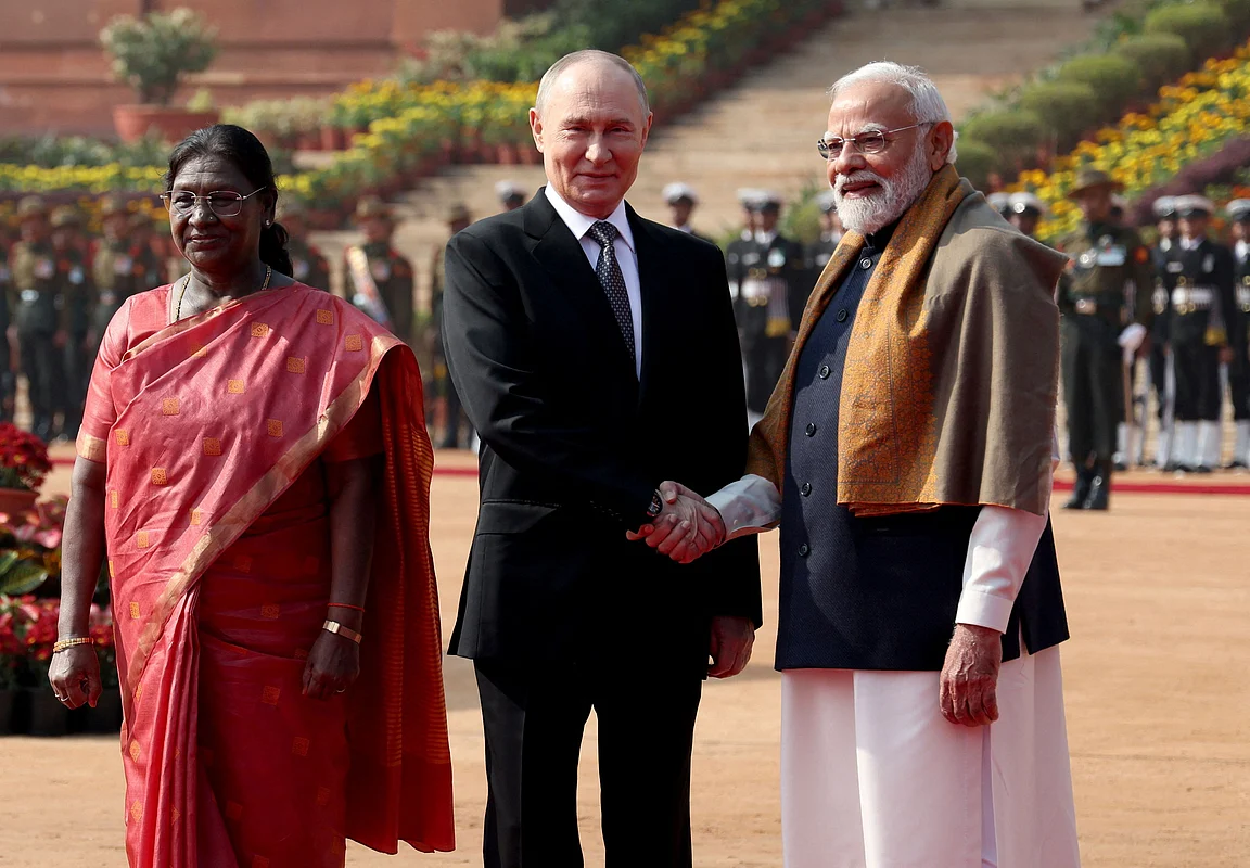 Russian President Vladimir Putin was welcomed by Indian President Droupadi Murmu and Prime Minister Narendra Modi as he received a ceremonial welcome and the tri-services guard of honour at the forecourt of the Rashtrapati Bhavan on Friday.
