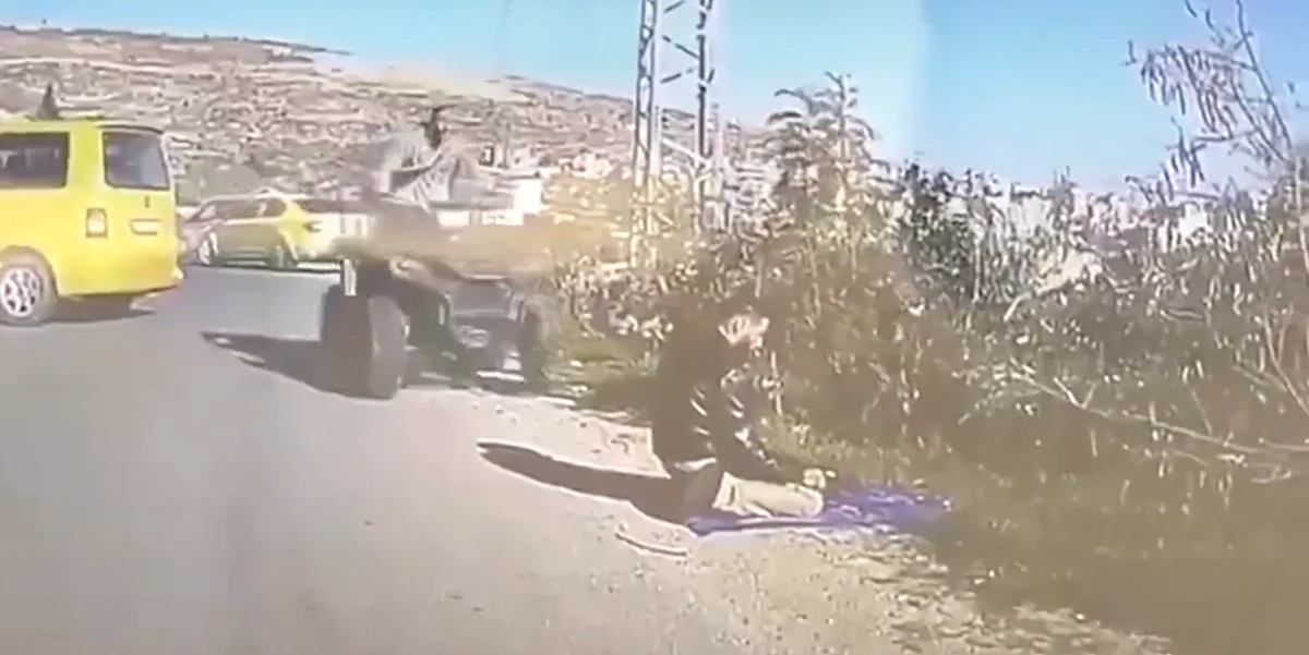 Video which aired on Palestinian TV and was verified by Reuters shows a man in civilian clothing with a gun slung over his shoulder driving an off-road vehicle into a man praying on the side of the road.
