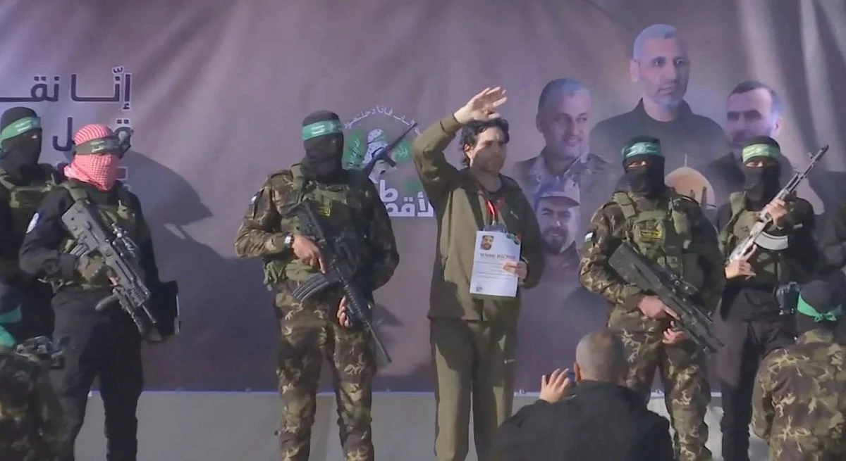 Ofer Kalderon and Yarden Bibas were paraded on a stage before being released to the Red Cross in Khan Yunis in southern Gaza. Israel's military later confirmed that Bibas and Kalderon were back on Israeli territory.