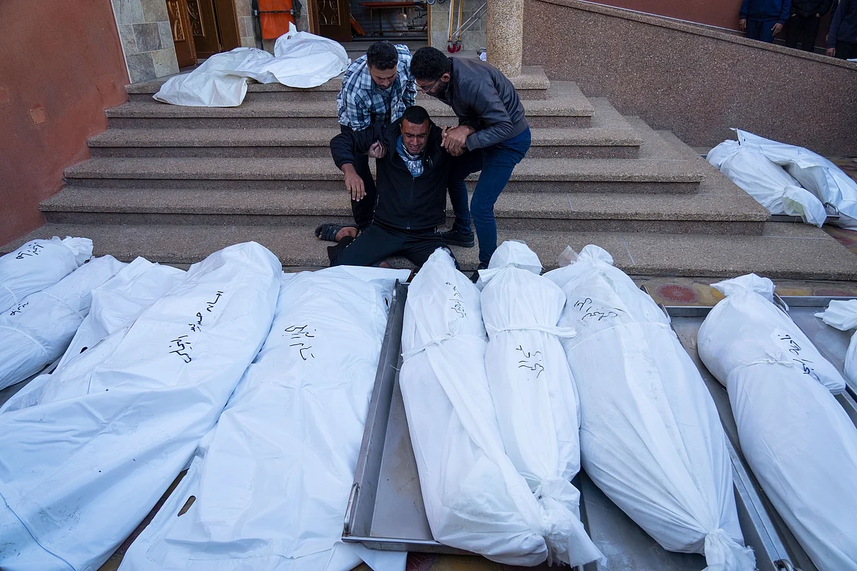 Outside a hospital morgue in Khan Younis, resident Samy al-Najeila carried the body of a child. He said his sons had been preparing to evacuate their home, “but the occupation didn't give us any time. The three-floor building was destroyed completely, the whole block was totally destroyed.” He said six of the bodies were his relatives.