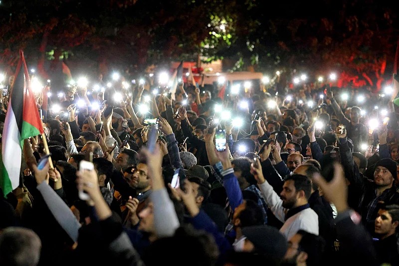 Hundreds of protesters gathered outside the British and French embassies in Tehran overnight. Several thousand gathered earlier in Palestine Square in central Tehran to voice their anger.