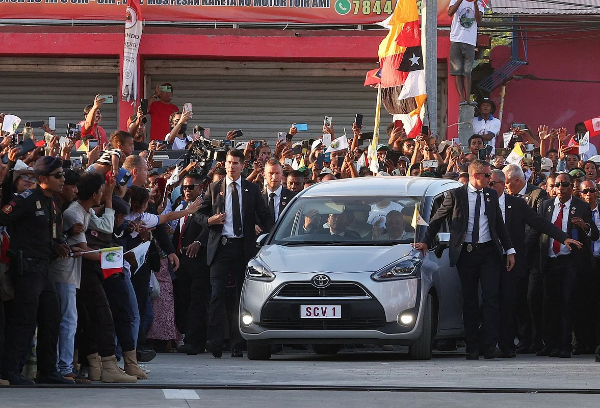 Tens of thousands lined the streets of capital Dili, waving Vatican-coloured flags and umbrellas while screaming as the 87-year-old was driven through the streets flanked by security.
