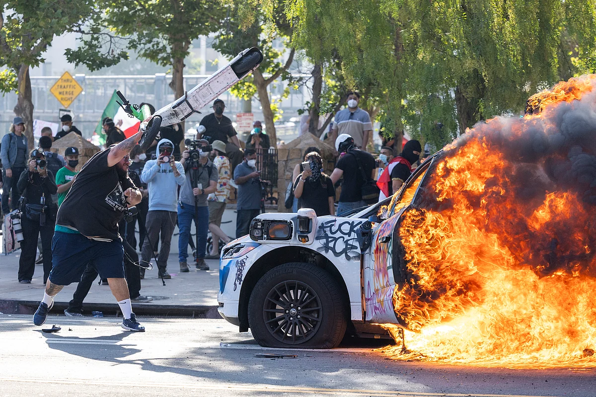 Demonstrators torched cars and scuffled with security forces in Los Angeles on Sunday as police kept protesters away from the National Guard troops President Donald Trump sent to the streets of America's second-biggest city.